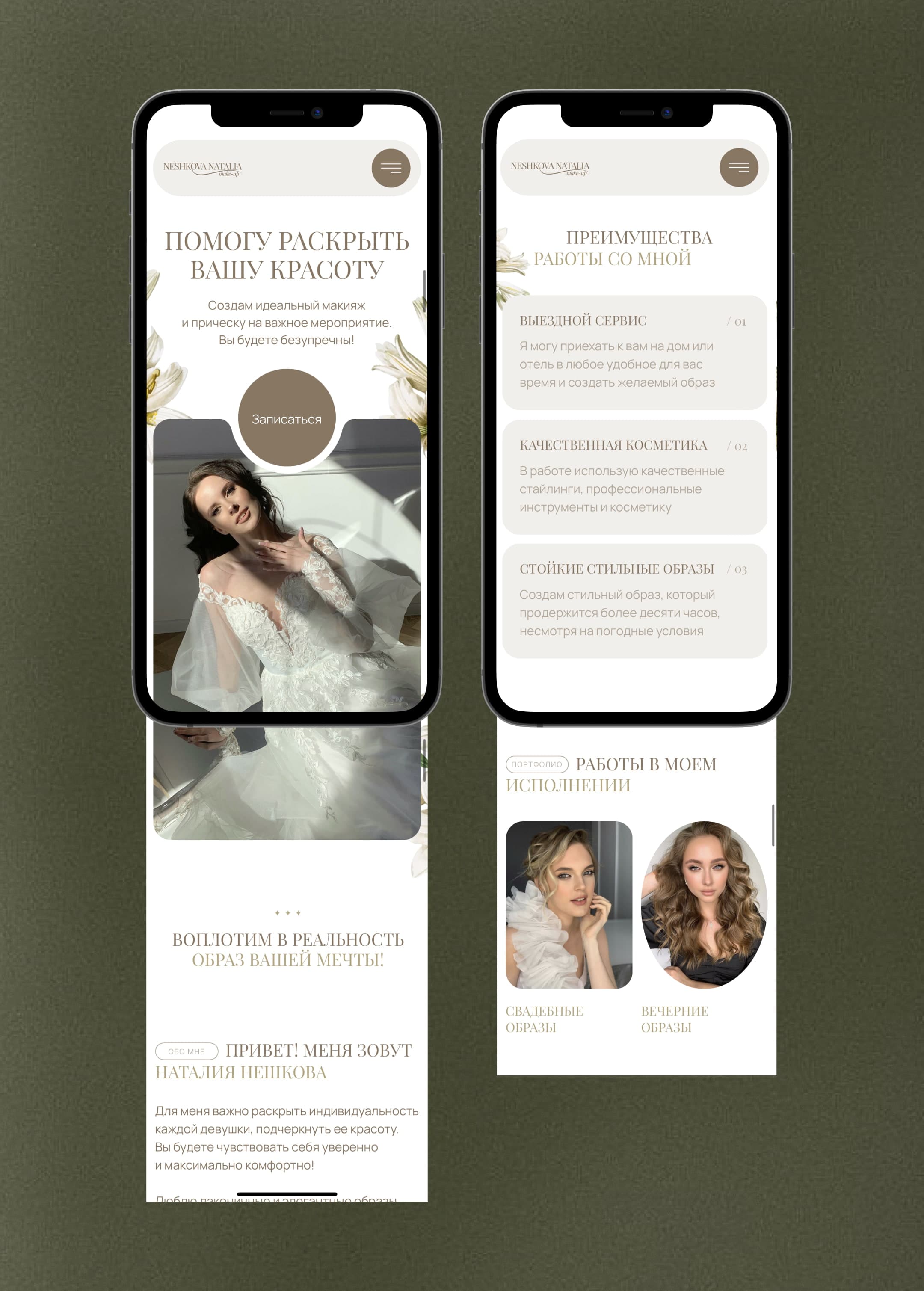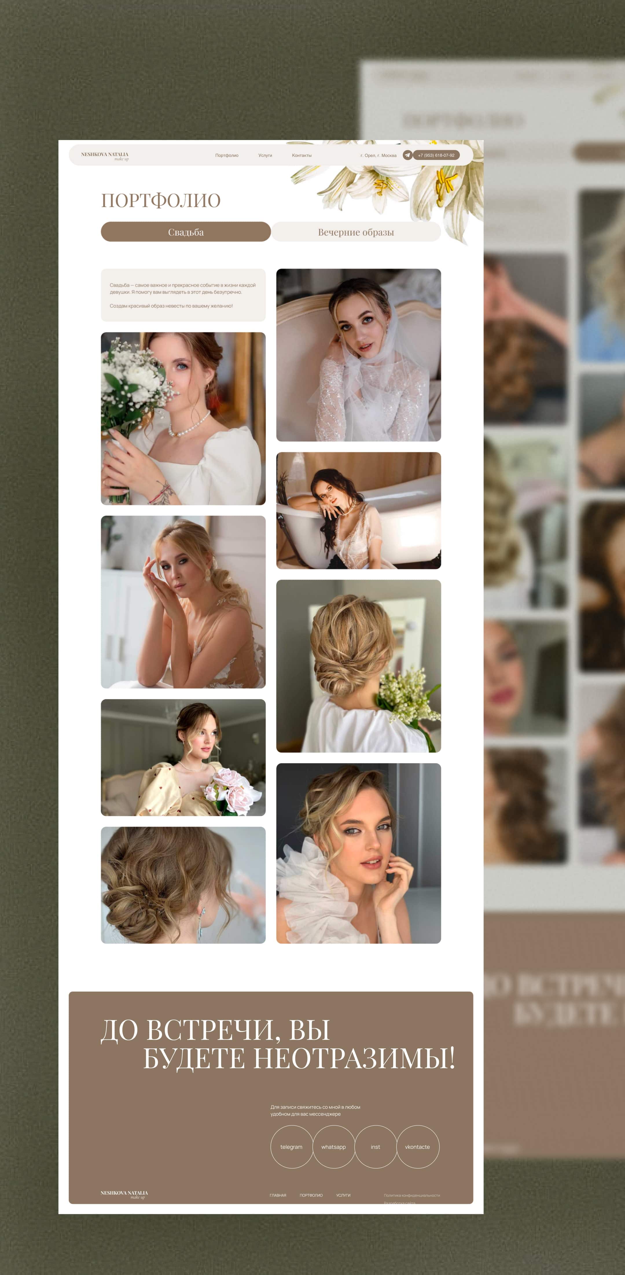 Основная аудитория Наталии — это невесты, а также мамы и подруги невест. Было принято сделать дизайн в светлых, природных тонах, за основу взять молочный цвет, а акценты — коричневый и оливковый для придания естественной красоты.