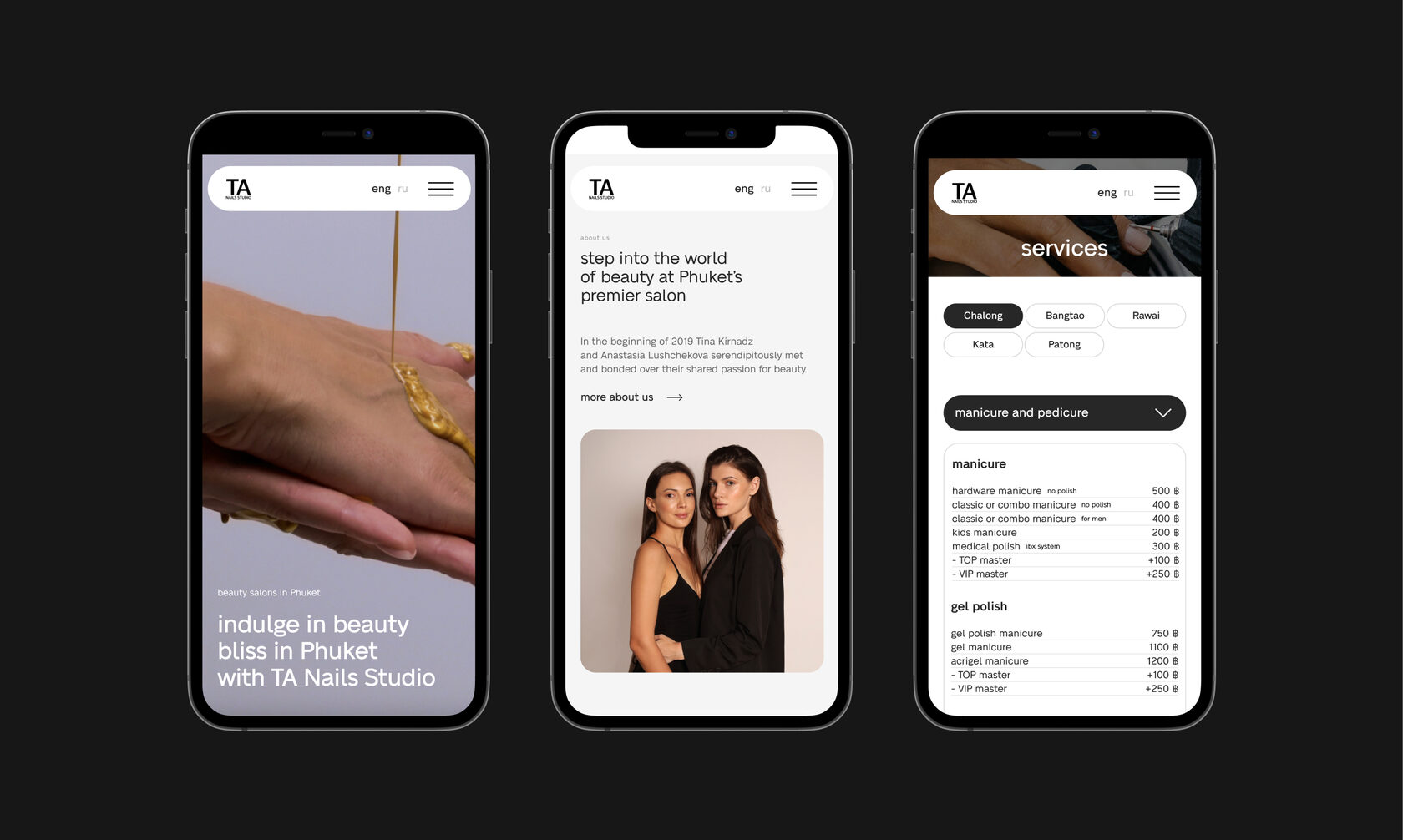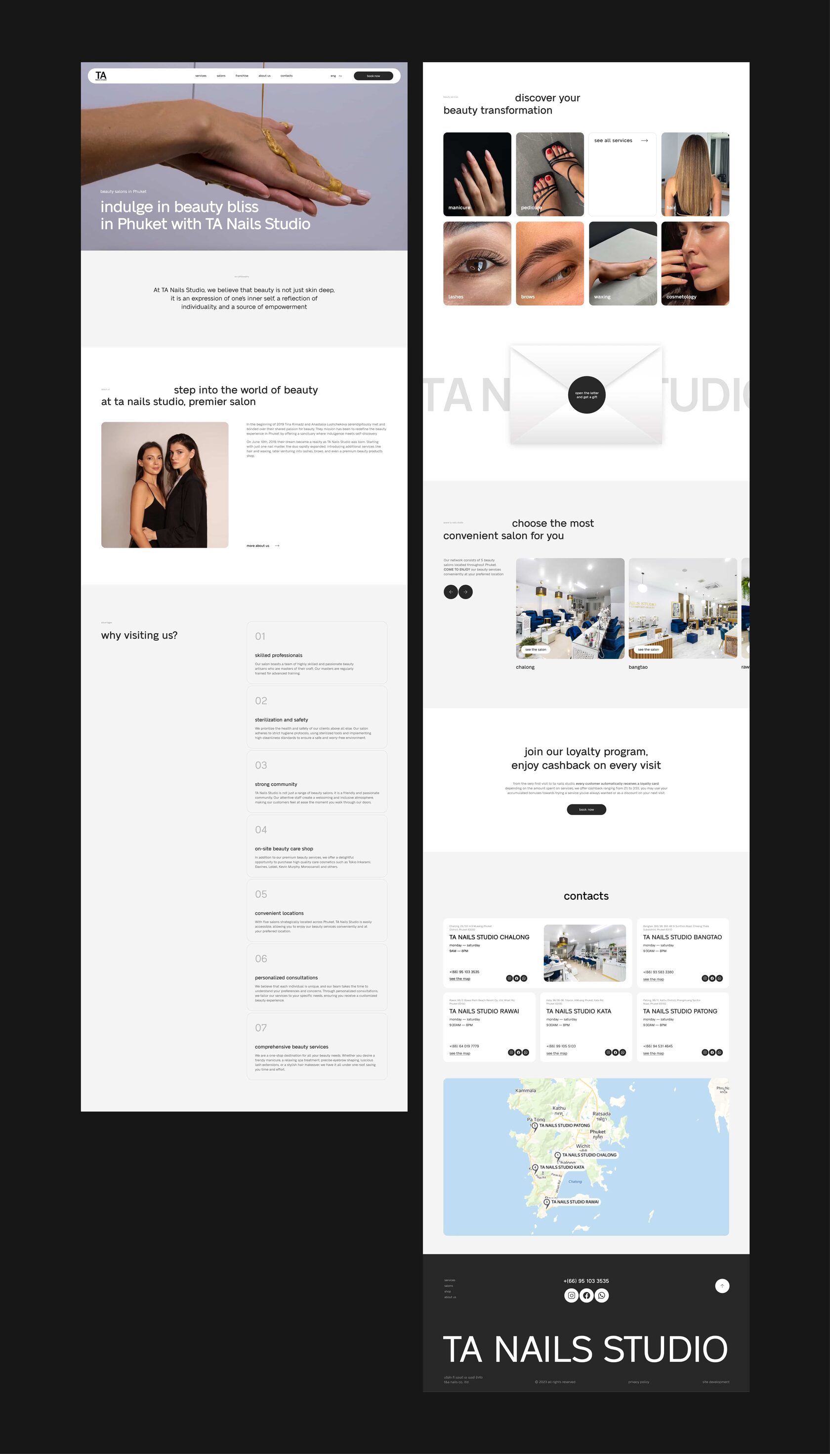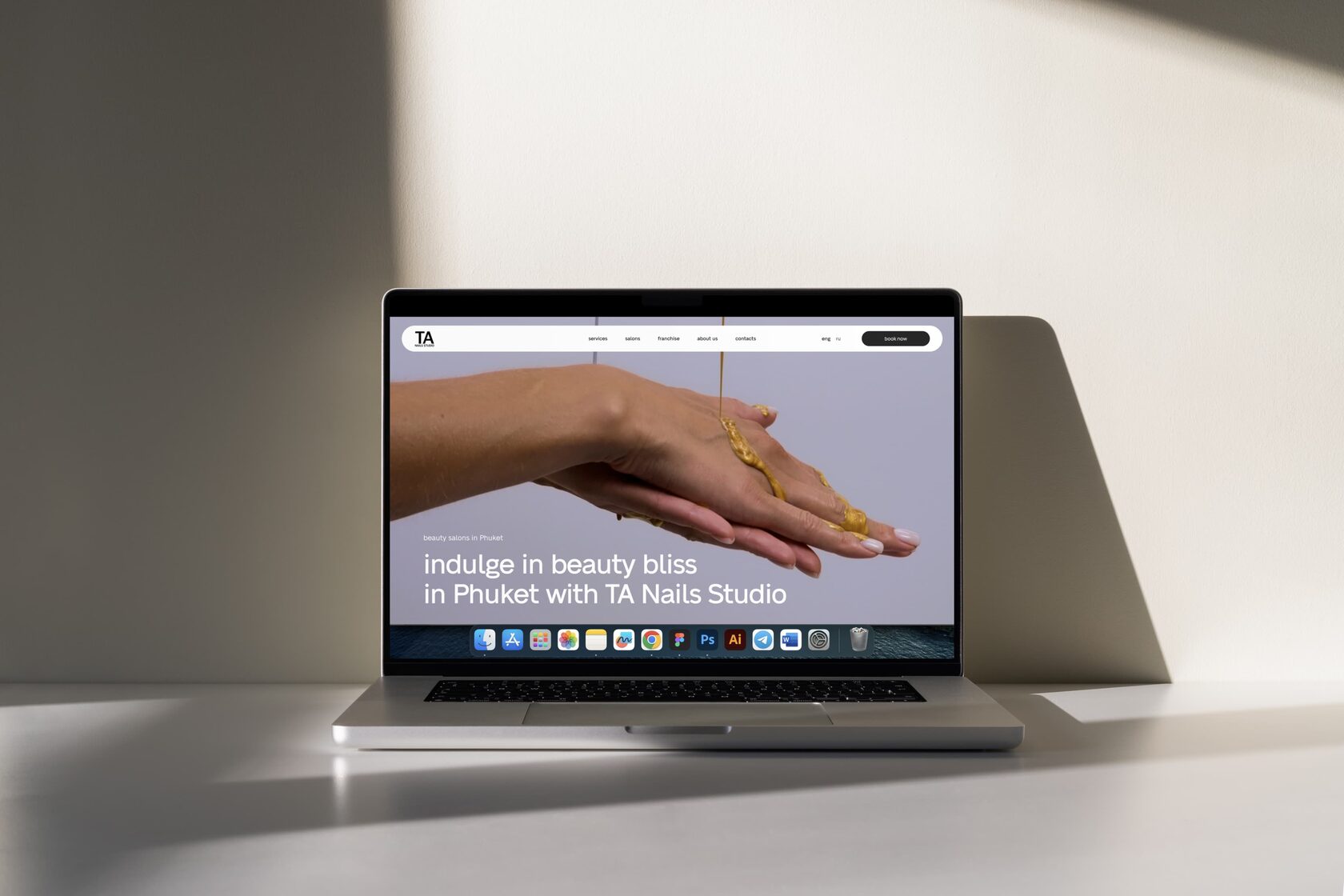 TA Nails Studio — это бьюти-пространство, состоящее из 5 салонов красоты на Пхукете. Задача — создать имидж и повысить лояльность с помощью корпоративного сайта и брендинга.