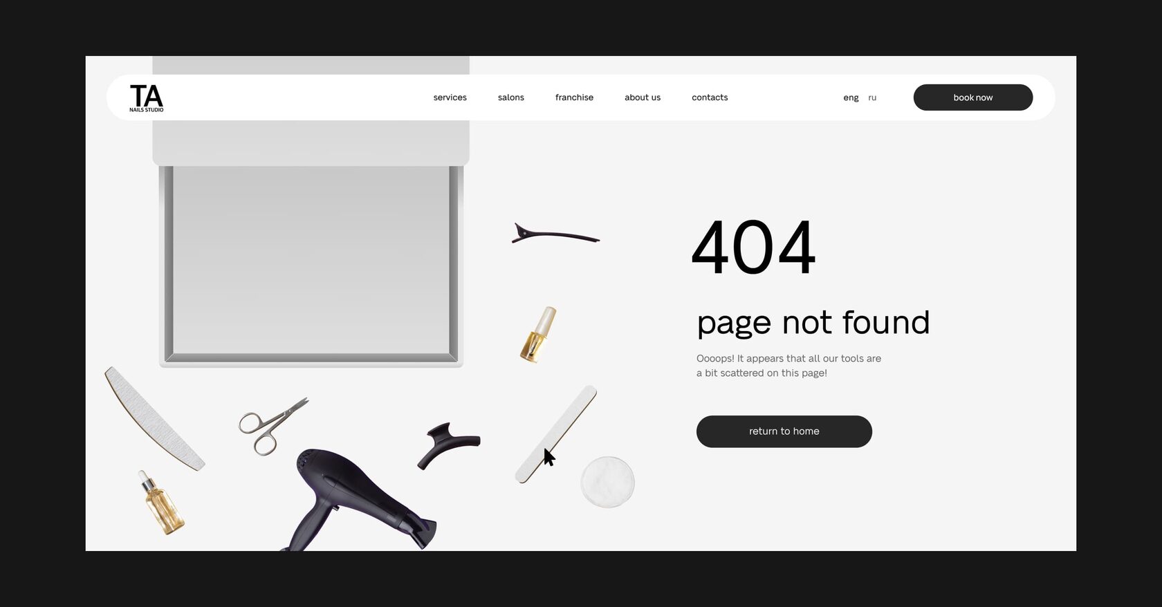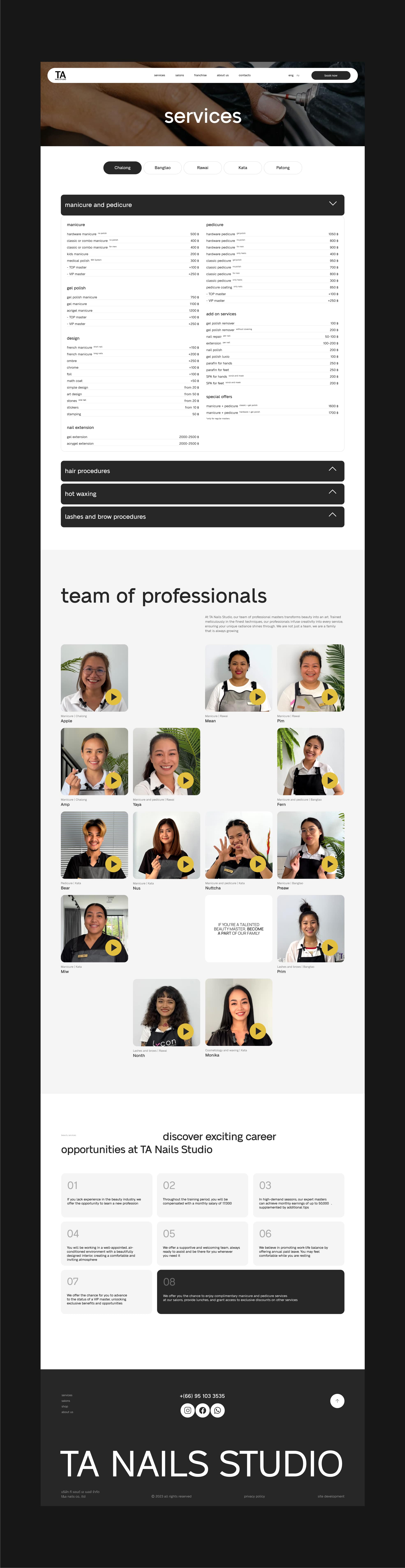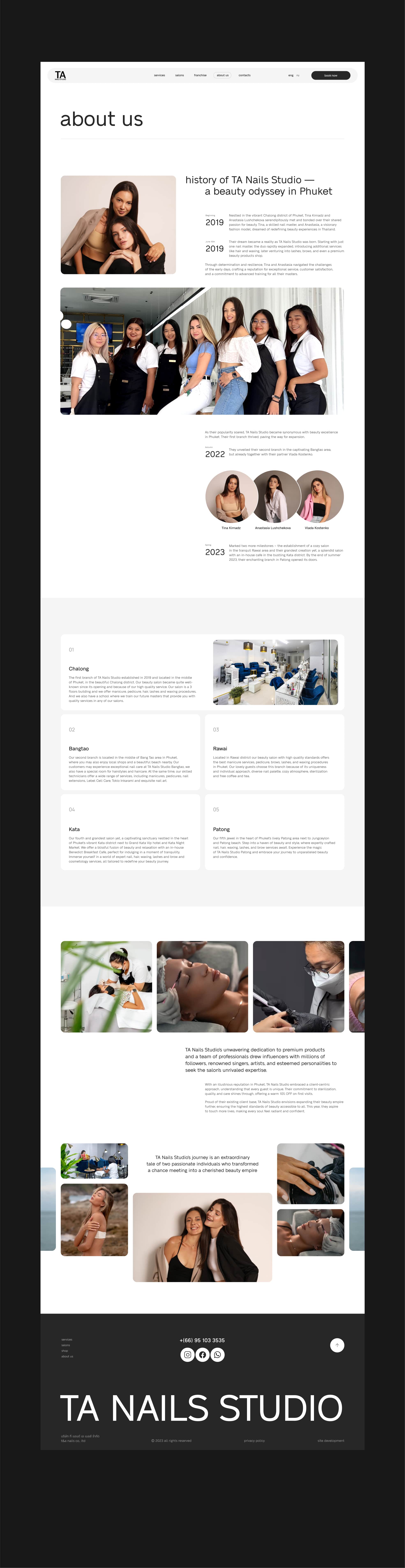 TA Nails Studio — это бьюти-пространство, состоящее из 5 салонов красоты на Пхукете. Задача — создать имидж и повысить лояльность с помощью корпоративного сайта и брендинга.