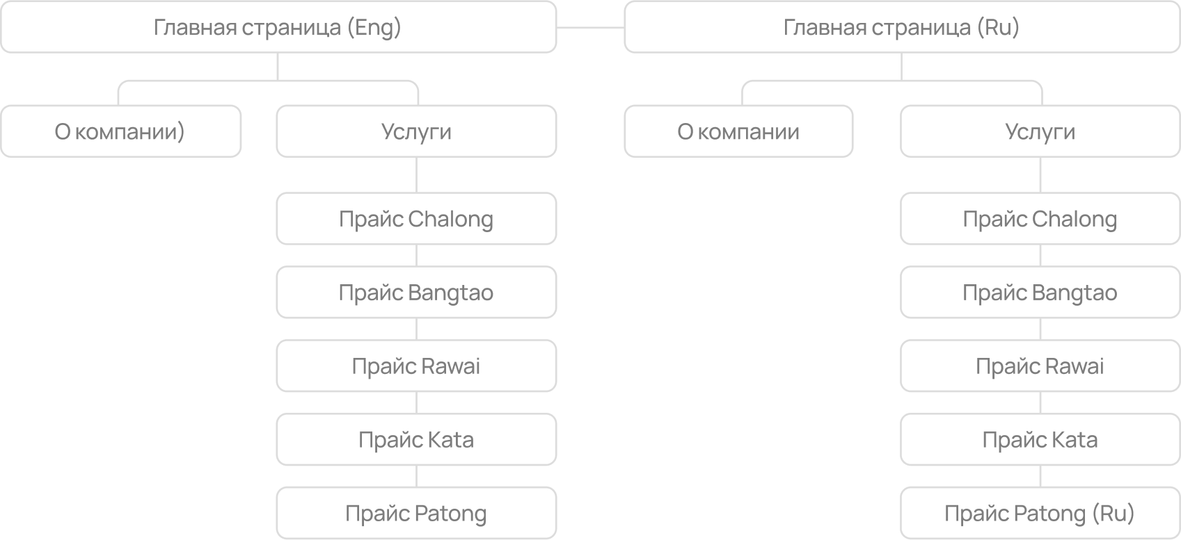 Исходя из анализа ЦА, принято решение создать сайт на 2-х языках Ru/Eng. Так как сеть расположена в Таиланде, а основная аудитория 80% русскоязычная, остальные 20% — тайцы, американцы, австралийцы, англичане и европейцы.